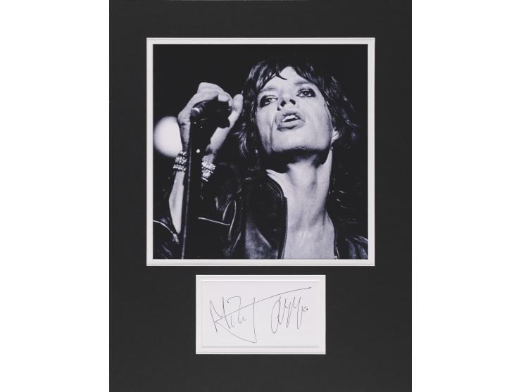 Large ballpoint signature, "Mick Jagger,” on a white 5.25 x 3 sheet, which is double-matted with a large photo of the Rolling Stones frontman to an overall size of 13.75 x 17.75. In fine condition.