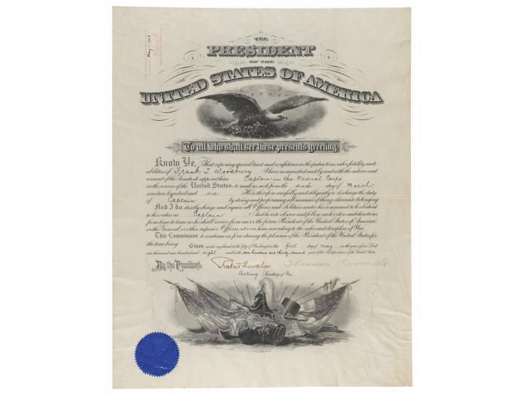 Partly-printed DS as president, one page, 15 x 19, May 1, 1908. President Roosevelt appoints Frank T. Woodbury as a "Captain in the Medical Corps in the service of the United States. Prominently signed at the conclusion in ink by President Theodore Roosevelt and countersigned by Acting Secretary of War Robert Shaw Oliver. The lower left corner retains the original blue War Office seal. In fine condition, with creasing, primarily in the margins.