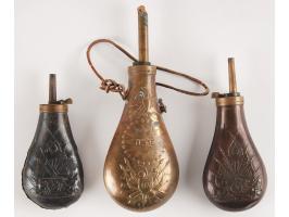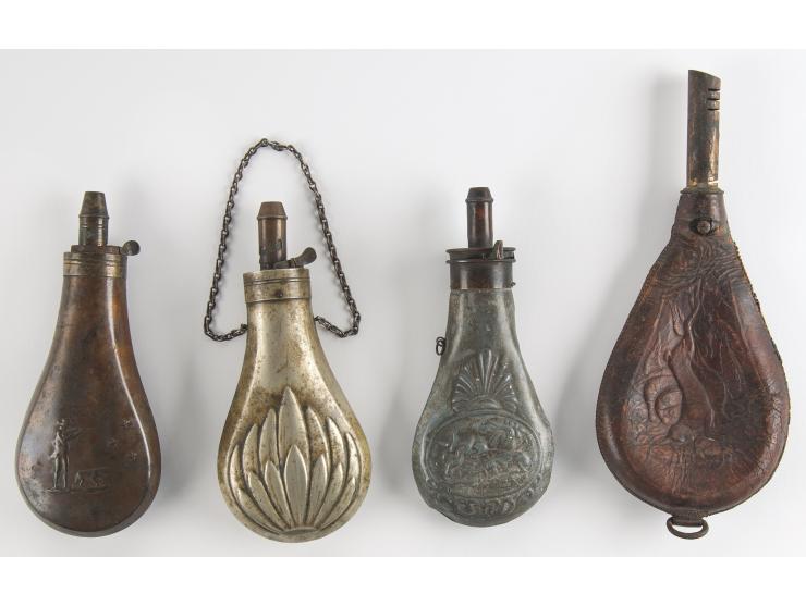 Group of four antique powder horns from the 19th-20th century, metal and leather, ranging in size from 3.25˝ x 7.5˝ to 4.25˝ x 10˝, each with embossed designs to the body. In overall very good to fine condition.