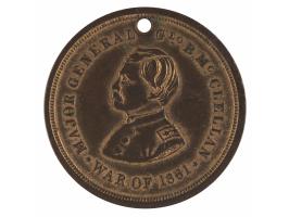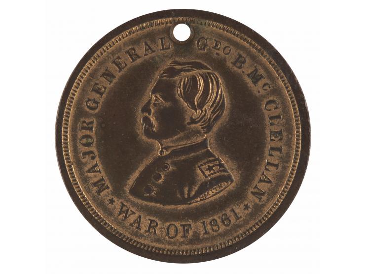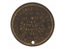 Remarkable original private-purchase identification disc of Private Richard Solon of Company H, 1st Michigan Cavalry, who saw action alongside George A. Custer's cavalry at Gettysburg. The excavated disc measures approximately 1.25˝ in diameter and features the portrait of Major General George B. McClellan on the front, with "War of 1861" below; the reverse is engraved: "Richard Solon, Detroit, Mich. Cedar Moun., Co. H., 1st Mich. Cav., Battles of Chantilly, Winchester, Bull Run." In very good to fine condition.