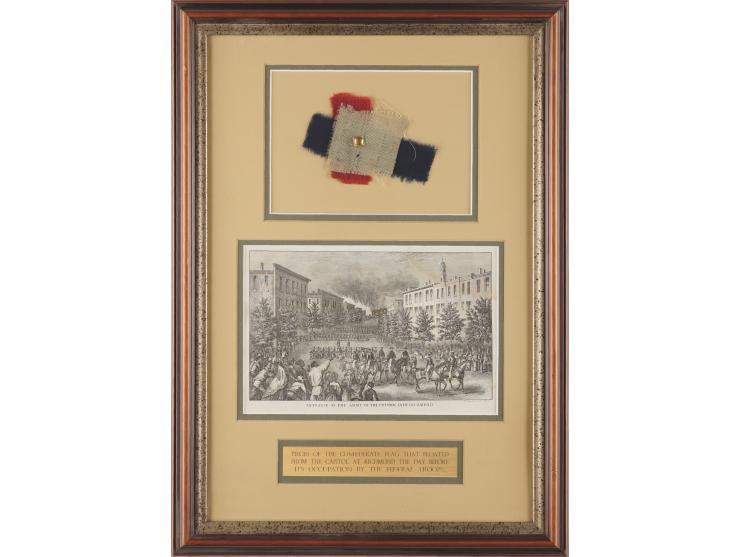Three fragments of attributed to the Confederate flag flown over Richmond on the eve of its occupation by Union forces—one red (3" x 1.5"), one blue (4.5" x 1.25"), and one white (2" x 2.5")—mounted with an original lithograph entitled "Entrance of the Army of the Potomac Into Richmond" and attractively matted and framed to an overall size of 14 x 20. An identification plaque below reads: "Relics of the Confederate Flag That Floated From the Capitol at Richmond the Day Before Its Occupation by the Federal Troops." In fine condition. Accompanied by a 1988 letter from the registrar of the Museum of the Confederacy, responding to an inquiry about the swatches, in part: "We do have several pieces of flag similar to the ones you describe in our collections, so I would have no reason to doubt the authenticity of your piece."