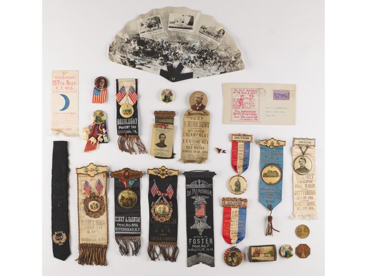 Large grouping of 23 pieces of Grand Army of the Republic (GAR) memorabilia, highlighted by ribbons, badges, and medals. Includes a "Boston GAR 1904" thin necktie; "Lincoln, Post No. 1, Topeka, Kansas" ribbon; "Henry A. Barnum, Post No. 656, Riverhead, N.Y." ribbon; "Elijah A. Morse, Camp 118, S. of V., Eastondale, Mass." ribbon; "John G. Foster, Post No. 7, Nashua, N.H." ribbon; "Doubleday, Post No. 189" ribbon; "Thirty-Sixth National Encampment, G.A.R., Washington, D.C….October 7, 1902" souvenir ribbon; souvenir ribbons from the 24th, 28th, 35th, and 37th annual "N.H. Veterans Association" reunions; a "21st Re-Union, 157th Regt., N.Y. Vols." ribbon; a souvenir ribbon from the "'Bucktails' Twelfth Annual Reunion" at Gettysburg in 1898; three pinback buttons honoring the 50th anniversary of the Battle of Gettysburg; an enameled "Gettysburg" pin; a postal cover honoring the 75th anniversary of Gettysburg; a match safe depicting Lee's headquarters at Gettysburg; a pictorial hand fan with scene of Pickett's Charge; and two commemorative Gettysburg coins.