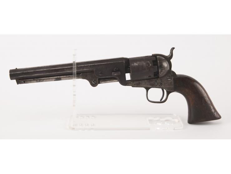 London Model Colt 1851 Navy .36-caliber single-action revolver, serial no. 41766, octagonal 7.5˝-long barrel, identified to Lt. Edwin Good of 'F' Company, 11th Regiment, New Jersey Volunteer Infantry (as attested by descendants in accompanying auction records and a description from The Horse Soldier Fine Military Antiques). Stamped on the barrel, "—Address Col. Colt London—," with matching serial numbers on all components: barrel, frame, triggerguard, loading lever, buttplate, cylinder, and wedge). One of the most sought-after sidearms ever produced, this is a fine, complete specimen with a dark patina.