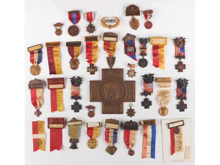 Large group of more than 30 "United Spanish War Veterans" badges, medals, and insignia, including: five member's medals; national encampment medals for New Orleans 1931, Milwaukee 1932, Denver 1929, Philadelphia 1930, Milwaukee 1946; state encampment badges for Indiana, Pennsylvania, New York, and Florida; an unnamed Sampson Medal with a USS Brooklyn bar; a Malate Cross presented by the 10th Pennsylvania Volunteer Infantry for Heroic Services in the Philippine Islands; and several others, most with patriotic or red-and-yellow ribbons. In overall very good to fine condition, with some splitting and fraying to ribbons.