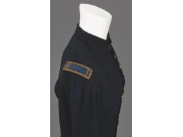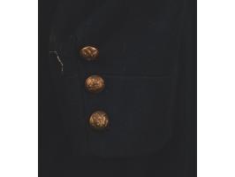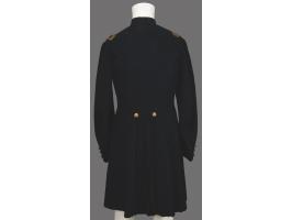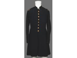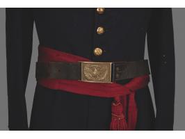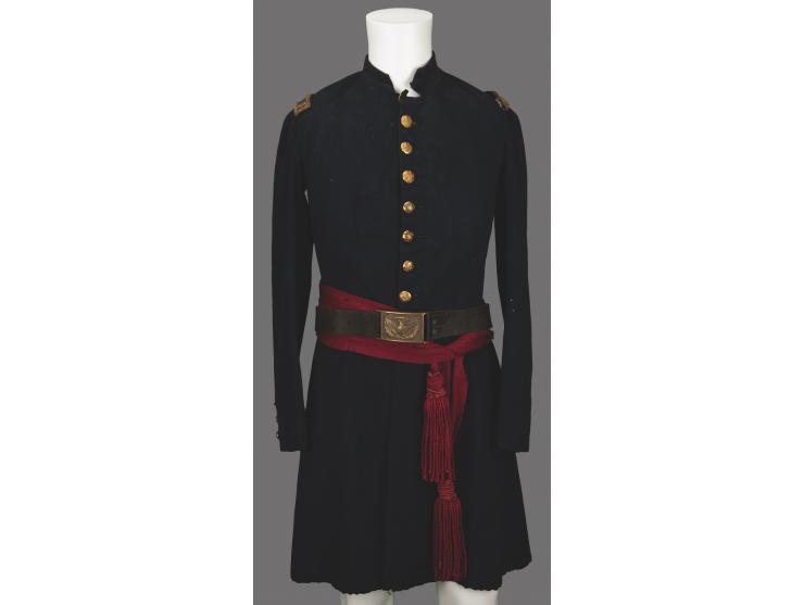 Union Infantry officer's deep blue frock coat with 1st lieutenant shoulder straps, scarlet NCO sash, and officer's belt with buckle. The coat features nine brass-tone post-war buttons, each bearing a spread-wing eagle with the "I" shield on its chest, denoting the infantry branch of service, and the back of each stamped by the Waterbury Button Company, a style that wasn't used until after the Civil War. Each cuff bears three similar buttons, with the reverse of those bearing war-era "Extra Quality” backmarks. The shoulder straps feature gold wire bullion borders and bars with a solid dark blue field. The included NCO sash approximately measures 92˝ in length, and the belt approximately measures 40˝ in length and features a brass-tone Union officer’s belt buckle numbered on the back, “82.” The condition of the coat is fair, with several moth holes and an old 6˝ stitched repair on the front breast; the sash is in very good condition; and the belt and buckle bear slight overall wear.