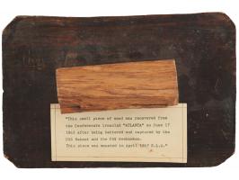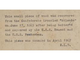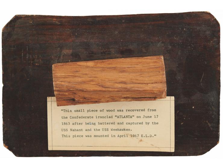 Section of 4.25˝ x 1.75˝ x 1.25˝ wood attributed to the USS Atlanta, an ironclad that served in the Confederate and Union Navies during the Civil War. Affixed to a 8.5˝ x 5.5˝ wooden mount, marked "CSS Atlanta," with attribution label affixed to the reverse: "This small piece of wood was recovered from the Confederate ironclad 'Atlanta' on June 17, 1863 after being battered and captured by the U.S.S. Nahant and the U.S.S. Weehawken. This piece was mounted in April 1967, E.L.D." In fine condition.