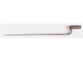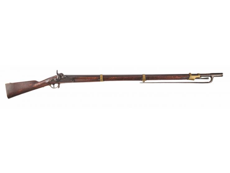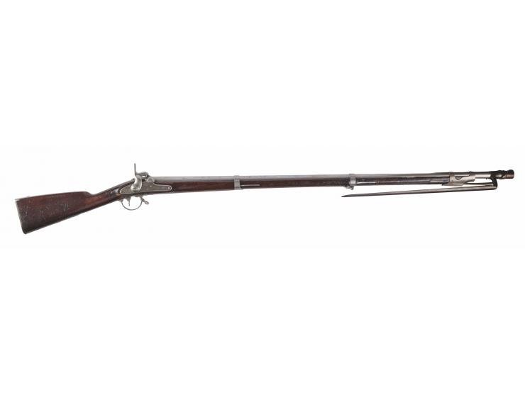 The walnut stock is in good plus condition with numerous handling marks and surface blemishes scattered about the thick, added oil finish. No inspector cartouche is visible, however there is a relatively crisp "4" stamp on the left side of the stock, just behind the sideplate. The action is tight and fully functional, with a correct, trumpet-headed ramrod also included. The musket is accompanied by an original "US" marked socket bayonet that measures 20 1/2" overall, with a 17 1/2" angular blade having a single wide fuller and hollow-ground back flutes. The metal has a mostly plum-brown patina with gray metal present along the raised edges. No scabbard is included. This is a great looking Model 1842 smoothbore musket, made by a desirable federal armory, and is in very good plus condition. Antique.