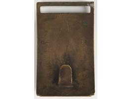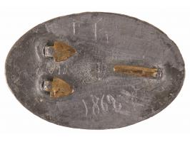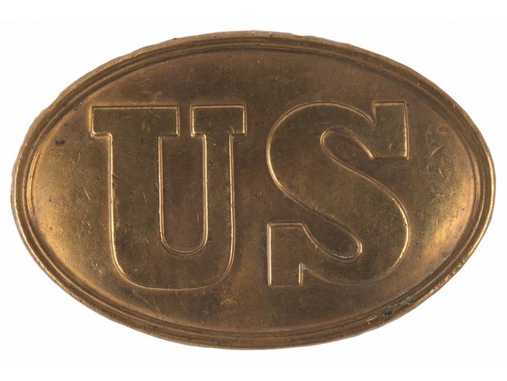 Non-excavated brass, die-struck, lead-filled Civil War US 1839 pattern oval belt plate measuring 3 1/2" across. The brass has an overall dull yellow-ochre patina with some small dents and faint surface scratches scattered across the face, but the "US" and double-beaded border are still clear and well-defined. The reverse has typical Civil War era arrowhead studs, with practically all of the original lead filling still in place. There are illegible scratches present, perhaps a previous owner’s name or unit, but the date "1862" is still legible. The plate is housed in a small Riker box with red cloth backing, and is a very good example of a Civil War era waist belt plate.