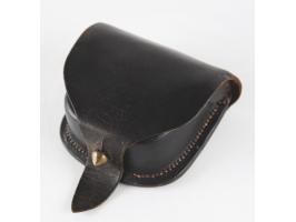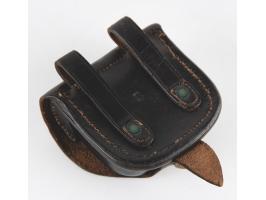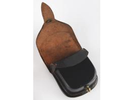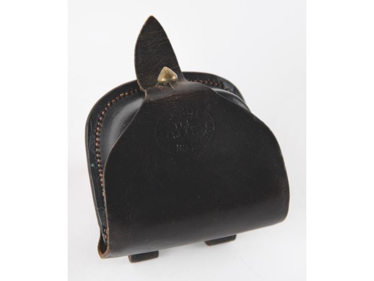Very handsome US-issue cap pouch that has extremely nice leather, with only some very minor crazing on the flex points of both the outer and inner cover flaps, as well as some slightly heavier crazing on the closure strap. The exterior flap has a soft, but still legible "R. WHITE / US / ORD. DEPT. / SUB INSPECTOR." stamp, while the inner flap has a maker’s stamp: "S.H. YOUNG & CO. / NEWARK / N.J." There is mild verdigris on the closure stud and belt loop rivets, while the original woolen lining is still present. An original wire vent pick is present in its holder along the sidewall as well.