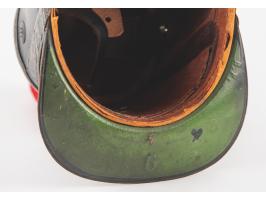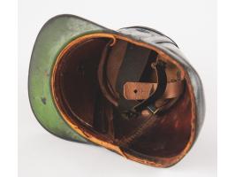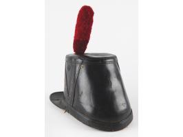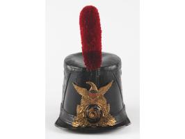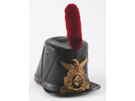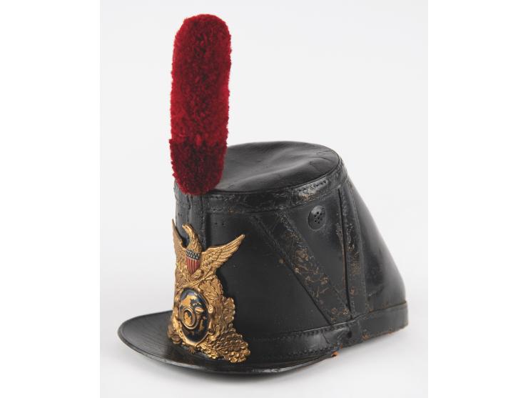Handsome early Civil War-era Chasseur-style leather shako military cap, identical in pattern to the French Model 1858 Chasseur Shako, and was almost certainly one of the 10,000 sets of Chasseur uniforms imported into the US circa 1860 by the Godillot company of Paris, France. The shako has most of the original tarred finish remaining, with some minor crazing and flaking throughout, heaviest on the squared peak and along the stiffening bands on the sides of the crown. The interior of the shako is missing the original comfort band, but is otherwise in fine shape, and has some portions of the original chinstrap remaining. The underside of the peak retains most of the original green paint finish, with large embossed "G" in the center. All of the stitched seams are still strong and intact. The front of the crown has the original painted sheet brass eagle and infantry horn plate, and a period replacement large maroon parade pompom as well; the pompoms that originally came with these shakos were shorter and had a more tapered "acorn" shape. Originally, there would have been a red, white, and blue metal cockade behind the eagle’s head, but that is no longer present. Additionally, there are two added holes on either side of the shako near the temples where a wearer-added chinstrap was once installed.
