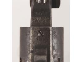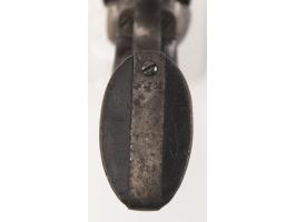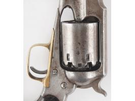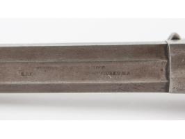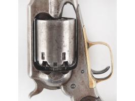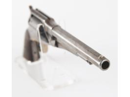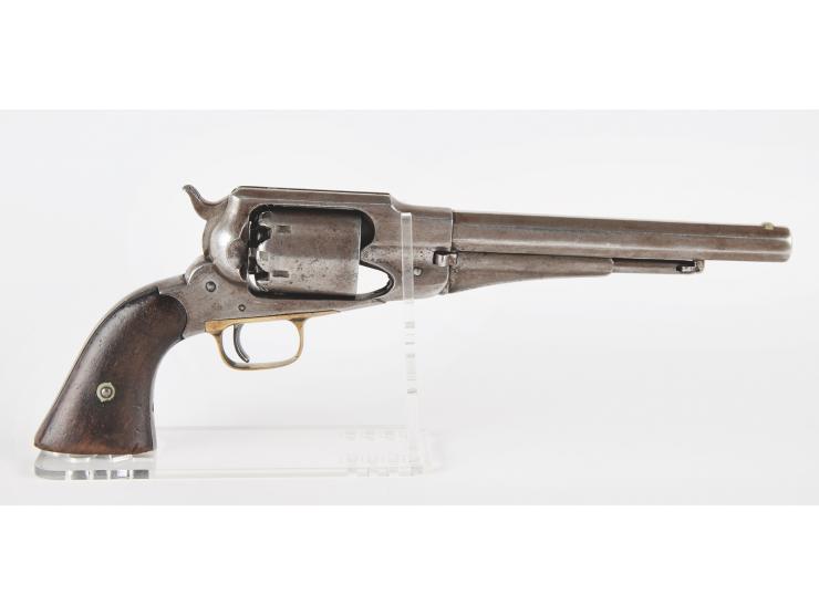 Civil War Remington New Model Army Revolver purported to have been found at a battlefield near Kennesaw Mountain, Georgia, serial #23894, .44 caliber, 8" octagon barrel with a fair bore that has light-moderate pitting within the grooves. This is a good looking revolver that was made ca. 1863, and has an overall dull pewter gray patina with spots of darker plum-brown freckling and small areas of pinprick pitting scattered throughout. Surface scratches are present on the cylinder, with a mild yellow-ochre patina on the trigger guard, and a heavily worn down front sight. The walnut grips are in fair shape with numerous handling marks present on both panels, as well as a large chip missing from the toe of the butt on the left side. There are no US inspector cartouches visible. The lock-up is solid, and the action functions well. A small modern display plaque accompanies the revolver that states that the revolver was, "Found in the Battle Fields around Kennesaw Mountain, GA." This is a good to very good example of a desirable Civil War revolver. Antique.