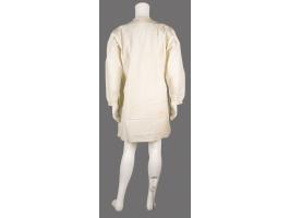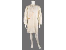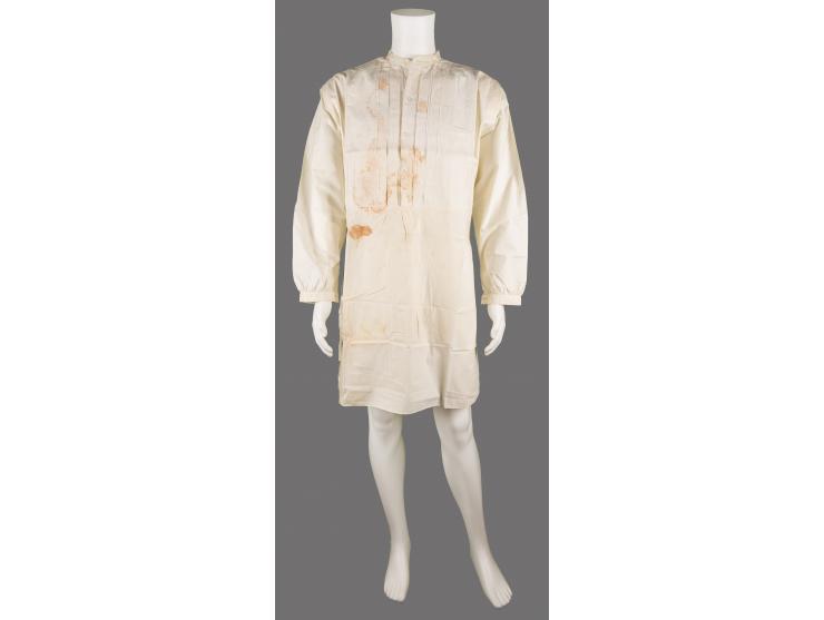 Attractive and little-worn Civil War–era linen shirt that has a pleated front, balloon sleeves, and very short cuffs. The material is fine, with virtually no wear, although there are some dark stains on the front of the shirt and around the neck. All of the buttons are still in place, including the small buttons for attaching a collar at the neck.