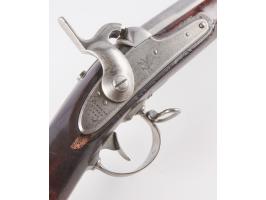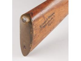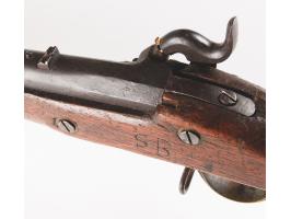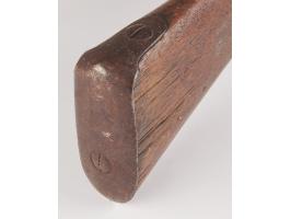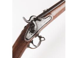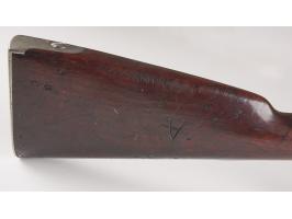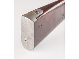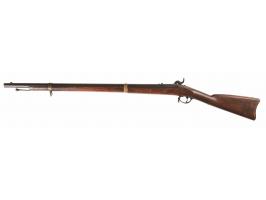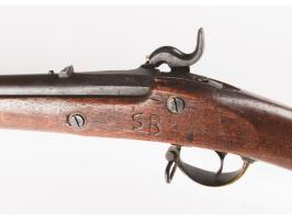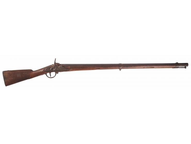 Civil War Confederate Fayetteville Type IV Percussion Rifle, approximately .67 caliber, 33˝ smoothbore barrel with a fine, lightly freckled bore. This is a so-called 'Model 1855' two band rifle that was altered to smoothbore at some point and given an enlarged bore diameter. The metal has an overall dark plum-brown patina with areas of light-moderate pitting, heaviest at the breech-end of the barrel and on the nipple bolster. Some further impact marks and minor scratches are present near the muzzle, as well as some small spots of white paint on the right side, and the rear sight is a single-notch replacement. Additionally, vise marks are present on the left side of the barrel breech. The 1864 dated lockplate matches the patina on the barrel, with the characteristic inverted "S" in the "CSA," and lacks the 'hump' present on the earlier types of Fayetteville arms. The walnut stock is not equipped with a patchbox, and has numerous small handling marks and small surface blemishes scattered throughout, as well as a stable with-the-grain crack running forward from the rear lock screw bolster, and some small chips missing from around the top tang. The wood retains an old varnish finish that thins considerably at the butt, and has a deeply carved set of initials on the left side opposite the lock, "SB." The brass furniture has developed a dark ochre-brown patina, including the "CSA" marked buttplate. The rifle is equipped with an original metal ramrod that is slightly bent near the head and shortened by about 2˝. The lock is mechanically excellent and functions firmly and flawlessly. This is a rare, late-war Confederate rifle in very good condition overall.