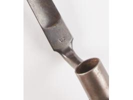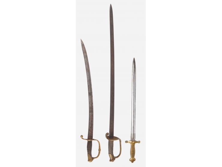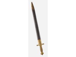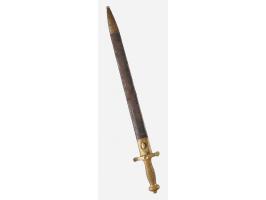 - a French Model 1855 Fireman’s Short Sword that measures 25" overall, with a straight, 19 1/2" double-edged blade having wide double fullers. This sword, very similar in design to the French Model 1831 Infantry Hanger, has a narrow straight-sided blade instead of the Model 1831’s wider and double-tapered Roman type blade. The steel retains much of the original factory polish, but does exhibit some dark freckling for about 1 1/2" at the tip. No markings are present on the ricasso, but many of these swords were manufactured at the armory in Klingenthal. The hilt features straight quillons with disk finials, grooved grip, and a rounded pommel with exposed capstan rivet, while the brass has an overall dull yellow-ochre patina throughout. The brass throat and chape of the scabbard have a matching patina, while the leather has moderate surface wear, and a partial break about halfway down on the obverse side. A partially legible marking is visible on the leather on the reverse: "(B or R)U(C)HE(?) & Ce." These swords were worn on ceremonial occasions and this example is in very good condition.