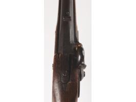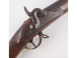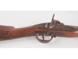 Privately made short percussion musket using a US Model 1795 Harpers Ferry lock, NSN, .71 caliber, 34 1/2" barrel with a dark, pitted bore. This musket was built using an 1814-dated Harper’s Ferry marked lock from a US Model 1795 flintlock musket. The barrel is a smith-made tube without markings, and has a percussion bolster-equipped breech plug mated to a French style percussion hammer. The metal has an overall lightly pitted dark brown patina with some thin surface oxidation present throughout, heaviest near and around the barrel breech. The action and barrel are fitted to a well worn US Model 1795 musket stock, heavily reworked for the new length and equipped with reworked original iron band and shortened nosecap. The wood has numerous small handling marks and blemishes throughout, as well as several breaks and cracks along the ramrod channel. The long rectangular inlets for the no longer present band springs were left unfilled on the right side of the forend. This is an interesting US musket, heavily reworked and converted to percussion.