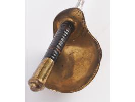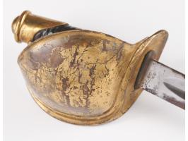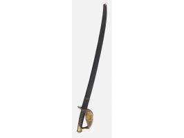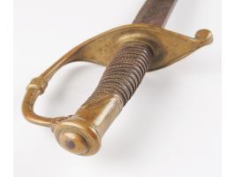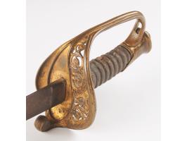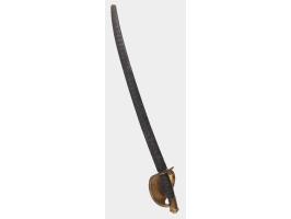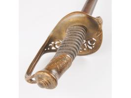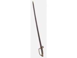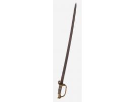 - an unmarked US Model 1850 Foot Officer’s Sword that measures 37 1/4" overall, with a 31 1/2" curved, single-edged blade having wide and narrow fullers. The unbent blade has an overall dark brown patina throughout, with moderate pitting and surface oxidation along the entire length on both sides. The brass hilt features a standard pierced counterguard, single forward-swept quillon, and knucklebow that meets an engraved "Phrygian helmet" pommel. The knucklebow has been bent straight in the middle, and the quillon is bent further forward than originally. The shagreen grip is separating where it meets the counterguard and is missing the braided wire wrap. No scabbard is included.