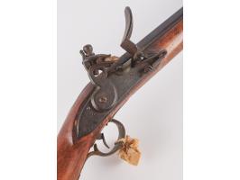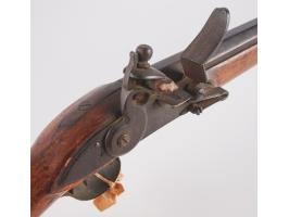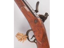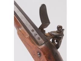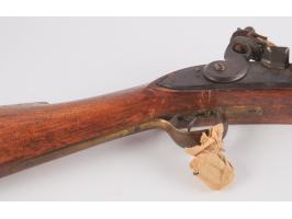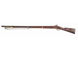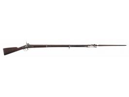 Prussian Model 1809/39 percussion musket with bayonet, NSN, .71 caliber, 41" barrel with a dark, pitted bore. This is a so-called 'Potsdam Musket' with all of the visible metal having a dark, plum-brown patina that has even pinprick pitting throughout that gets quite heavy on and around the nipple bolster. The lockplate is marked "POTSDAM" just ahead of the hammer, while the barrel has some visible proofs, and an "1826" date on the left flat. The brass barrel bands and trigger guard have a frosted yellow-ochre patina throughout. The stock has small handling marks and surface blemishes scattered about the otherwise quite nice old oil finish, with some heavy erosion on the right side of the wrist just behind the nipple bolster. Additionally, there are some initials carved into the buttstock on the left side: "T (or possibly an ‘L’) D." The action does not lock at full-cock, and the sear is worn so that the hammer will drop from half-cock. An original trumpet-headed ramrod is present, as well as an original socket bayonet that measures 22 1/2" overall, with a 19" angular, unfullered blade without back flutes.