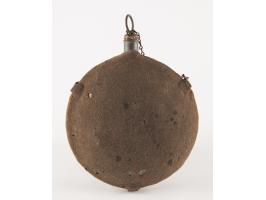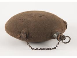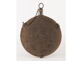 This is the smooth-side variant oblate spheroid canteen with three fixed metal bails for the no longer present cloth strap. The canteen has no visible maker’s markings on the spout, and only has two shallow dents, one on either side. The body of the canteen retains the original gray-brown jean cloth cover, which has intact seams, but also has numerous minor stains, as well as several small spots of insect damage throughout. The original worn, but still serviceable, cork stopper is still attached to one of the bails via the original short metal chain. A fine example of a US Civil War canteen.
