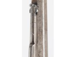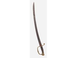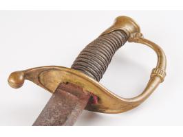- a short European Infantry Hanger, or ‘Briquet’ that measures 29 1/2" overall, with a 23 7/8" curved, single-edged blade having single wide fullers. The blade has a mottled patina with some fairly bright gray along the foible, but dark freckling at the tip and mottled brown surface oxidation on the forte. No markings are visible on the ricasso, nor on the back edge. The brass hilt has a narrow counterguard, single forward-swept quillon, and a knucklebow with decorative accents at the midpoint and where it meets the pommel. The brass has an overall dull ochre patina while the leather grip has a loose, but intact braided wire wrap. No scabbard is included.