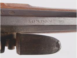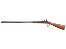 American flintlock fowling gun with French 1763-1766 Pattern musket lock, marked "Israel Bean / Sandwich / 1788" on the stock, NSN, .67 caliber (approx. 16 bore), 39" octagon breech barrel with a dark, pitted bore. This is a well-made and attractive fowler that has a "LONDON" marked barrel with crisp London proofs on the breech, mated to a "Charleville" marked French musket or fusil lock. The metal has an overall dark plum-brown patina throughout, with mild pitting on the barrel breech, and some deeper pinprick pitting on the lock, which is fully functional and catches firmly at both half and full-cock. The half-length sporting style stock has a darkly tarnished brass nosecap, with small handling marks and minor blemishes in the otherwise nice period oil finish. The brass trigger guard and buttplate are in very good shape, and exhibit a dull, yellow-ochre patina throughout. The gun is accompanied by an old trumpet-head musket ramrod.