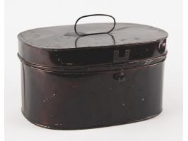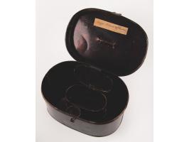 Pair of Civil War–era full dress epaulettes with bullion wire shoulder brooms, gilt Federal Eagle with "A (in shield)" Artillery service branch buttons, and embroidered silver wire full colonel’s eagle insignia. The undersides are marked "RIGHT" and "LEFT" with no retailer’s marking present. The small button clip is missing on the right side epaulette, but the hinged retaining bars are still present on both. The thin red leather backing is worn through in a few spots, but the bright red velvet backing for the shoulder brooms is in excellent, virtually unworn condition. The epaulettes are housed in an oblong japanned tin case that measures 9 7/8" long x 7" wide x 5 7/8" deep. The case retains nearly all of the original japanned lacquer finish, with only some very minor spots of flaking along a few of the exposed edges, and on the remaining portions of the broken cover latch. The interior of the case retains a commensurate amount of japanned finish with a coiled pair of narrow leather straps with brass buckles housed in the central pillar compartment. A small paper label is affixed to the inside of the lid that reads, "Major General Nathaniel P. Banks," in black ink.