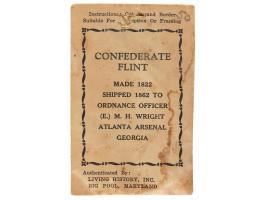 Piece of Confederate flint, measuring approximately 1.25˝ x 1˝, with its envelope from Living History, Inc., imprinted: "Confederate Flint, Made 1822, Shipped 1862 to Ordnance Officer (E.) M. H. Wright, Atlanta Arsenal, Georgia." In fine condition, with wrinkling to the envelope.
