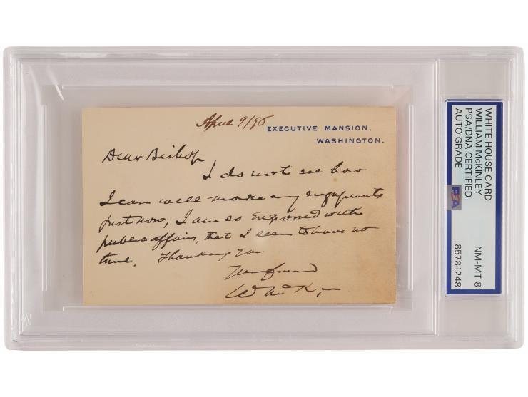 ANS as president, signed โW. McKโ,โ one page on an official 4.25 x 2.75 Executive Mansion card, April 9, 1896. Handwritten note to "Bishop," in full: "I do not see how I can well make any engagements just now, I am as engrossed with public affairs, that I seem to have no time." In fine condition, with some light soiling. Encapsulated and graded by PSA/DNA as "NM-MT 8."