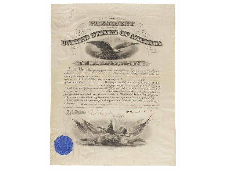 Partly-printed vellum DS as president, one page, 15 x 19.5, January 16, 1899. President McKinley appoints Charles B. Gwynn as "Second Lieutenant in the Third Volunteer Engineers in the service of the United States." Boldly signed at the conclusion in ink by President William McKinley and countersigned by Secretary of War Russel A. Alger. The embossed blue seal affixed at the lower left remains intact. In fine condition, with a small chip to the left edge.