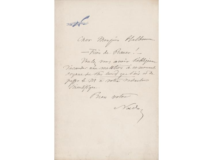 ALS in French, signed “Nadar,” one page, 5.25 x 8.25, personal letterhead, no date. Handwritten letter by the noted photographer, in full (translated): "Would you be so kind as to grant a mention to this new publication concerning heavier-than-air flight and to forward the issue to your scientific editorial staff." In very fine condition. Nadar coined the term "plus lourd que l'air"—heavier than air—in 1863 to designate flying machines or aerodynes as opposed to balloons.