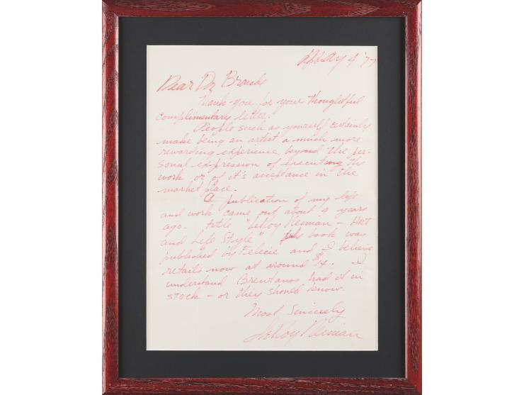 ALS, one page, 10.5 x 13.5, May 4, 1977. Handwritten letter to "Dr. Brand," in part: "Thank you for your thoughtful complimentary letter. People such as yourself certainly make being an artist a much more rewarding experience beyond the personal expression of executing the work or of it's acceptance in the marketplace. A publication of my life and work came out about 4 years ago, title 'LeRoy Neiman—Art and Life Style.'" Matted and framed to an overall size of 14.5 x 17.5. In fine condition.