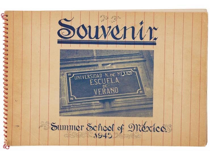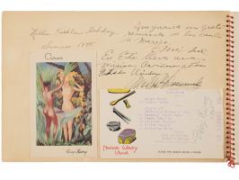 Menu from the Hotel Geneve in Mexico City, one page, 6.25 x 9.5, August 11, 1945, signed at the bottom in fountain pen, "Diego Rivera, 1945." Affixed inside the front cover of a souvenir album from the Summer School of Mexico, alongside a postcard of one of his works featuring a printed signature. In fine condition.