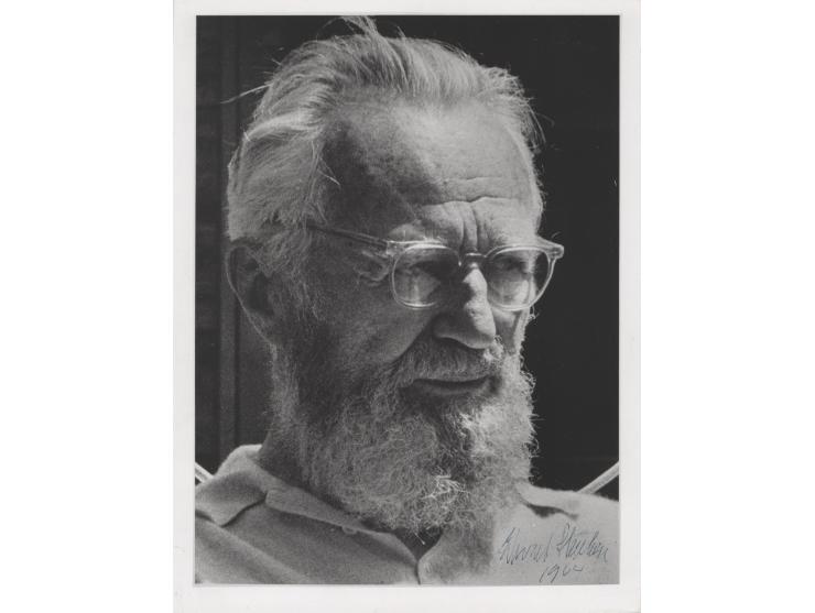 Vintage semi-glossy 7.25 x 9.5 head-and-shoulders photo of the famed photographer, signed in ballpoint, "Edward Steichen, 1964." In fine condition.