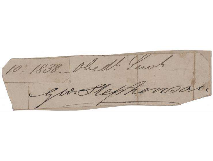 Ink signature, "Geo: Stephenson,” on an off-white 4.5 x 1 slip bearing an affixed date tab of "1838." Applied to a slightly larger cardstock mount and in very good to fine condition, with irregular trimming and several vertical folds.