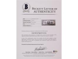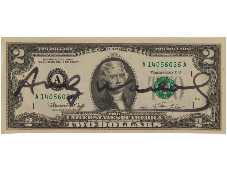 Series 1976 two-dollar bill, prominently signed on the portrait side in black felt tip by Andy Warhol. In fine condition. Accompanied by a full letter of authenticity from Beckett Authentication Services. Consignor notes that this was signed at an event in New York City, circa 1984.