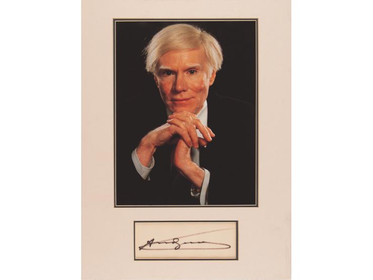 Felt tip signature, "Andy Warhol,” on an off-white 5.5 x 2 card, double-matted with a portrait to an overall size of 12 x 15.75. In fine condition.