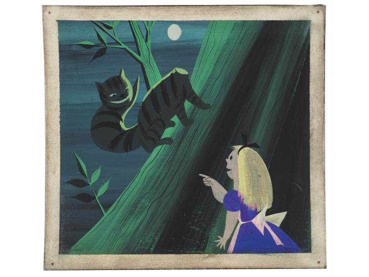 (Walt Disney Studios, 1951) Incredible original concept painting by Mary Blair for Alice in Wonderland, showing Alice talking with the Cheshire Cat in his tree in the Tulgey Wood; the cat offers his trademark mischievous grin while he balances his disembodied head on his wide striped tail. Rendered in surreal shades of green, blue, and black, the moonlit scene is a superb example of Blair's artistic style—the composition dominated by striking contrasts of dark and light, as Alice and the Cat meet at the boundary between the commonplace and the supernatural. Accomplished in tempera on 9.25 x 8.5 artist's board. In fine condition, with tack holes at corners.