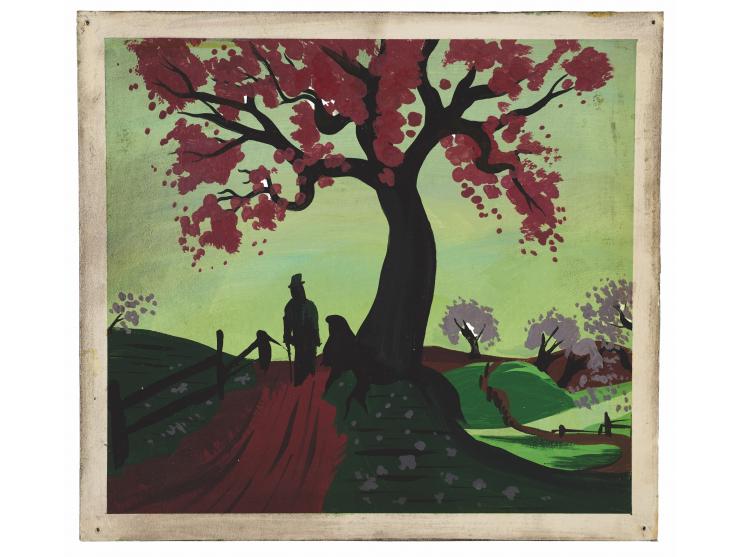 (Walt Disney Studios, 1946) Nice original concept painting by Mary Blair for Song of the South, showing Uncle Remus passing by the Tar Baby on the road while singing 'Zip-a-Dee-Doo-Dah.' Inspired by a classic folktale as told by Joel Chandler Harris in his 'Uncle Remus' stories, Blair expertly executes the Southern scene, stylishly rendering the blooming magnolia trees and fence along the road, with the subjects silhouetted against the green-hued sky. Accomplished in tempera on 9.75 x 9 artist's board. In fine condition, with tack holes at corners.