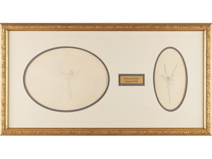 (Walt Disney Studios, 1940) Original production drawings of two fairies from Fantasia, depicting the sprites in full-figure poses as they appeared in the film's gorgeous Nutcracker Suite, one holding a wand and the other with arms raised and wings spread. Both are accomplished in graphite on sheets of animation paper measuring 4 x 8 and 11 x 8. Double-matted and framed together to an overall size of 28.5 x 15. In overall fine condition, with a crease to the larger sheet.