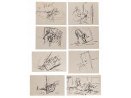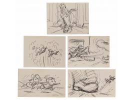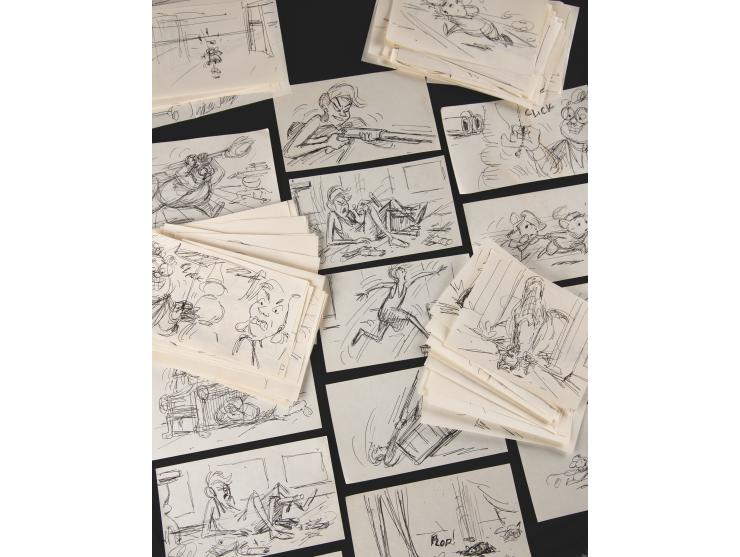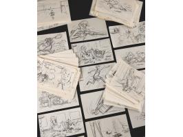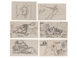 (Walt Disney, 1977). Collection of 113 original preliminary storyboard drawings by Ted Berman for The Rescuers, which features characters like the mouse heroes Bernard and Miss Bianca, as well as the villains Mr. Snoops, the alligators Brutus and Nero, and Madame Medusa, the latter of whom is featured most prominently. The majority of the drawings occur around the 48:54 mark of The Rescuers, when Madame Medusa gets startled by Bernard and Bianca and, without hesitation, starts shooting her shotgun to get rid of the poor mice. The drawings are accomplished in graphite, ink, and felt tip on off-white studio bond paper ranging in size from 6 x 4.5 to 9 x 5. In overall fine condition.