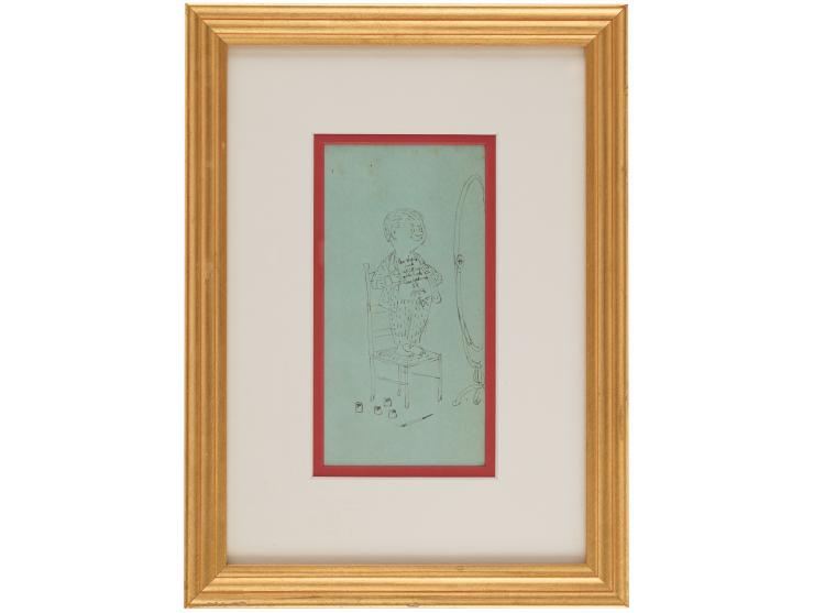Highly desirable ink sketch of Pugsley from The Addams Family drawn by Charles Addams on a green 3.75 x 7.5 sheet, signed and inscribed on the character's chest, "For Middy and Whitney, with love, Chas. Addams." Attractively double-matted and framed to an overall size of 10.5 x 14. In fine condition.