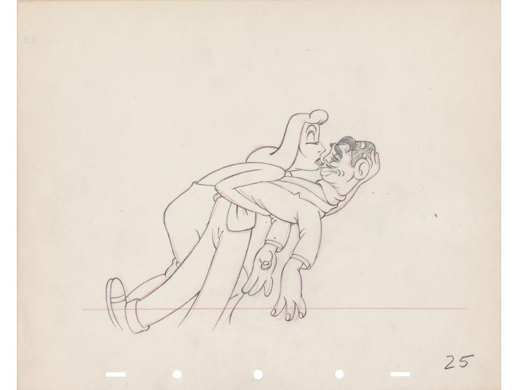 (Walt Disney Studios, 1939) Original production drawing of Greta Garbo and Clark Gable from The Autograph Hound, showing the Hollywood icons in a dramatic embrace. Accomplished in graphite and colored pencil on untrimmed 12 x 10 animation paper marked "25" in the lower right corner. Image measures 7 x 5.5. In fine condition.