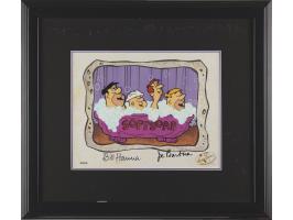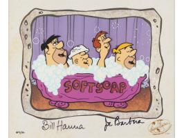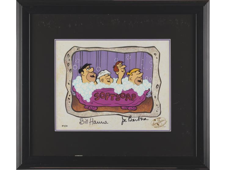 (Hanna-Barbera Studios, 1994) Original limited edition cel for The Flintstones, numbered AP 5/30, featuring Fred Flintstone, Barney Rubble, and two construction workers singing in a bathtub for a ‘Soft Soap’ commercial. The cel, which is comprised of the bathtub, its occupants, and floating and popping bubbles, is placed on a matching production background. The total character image measures 8.5 x 5.25, with a mat opening of 12 x 9.5. Double-matted and framed to an overall size of 21 x 18.5. The lower right corner bears a Hanna-Barbera seal numbered "24547." In fine condition, some wear to the frame.