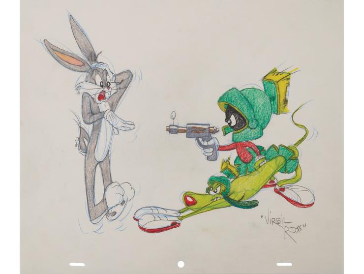 (Warner Bros. Studios, 1990s) Original drawing by Virgil Ross showing Marvin the Martian, with his dog, K-9, pointing a space gun at a distraught Bugs Bunny. Accomplished in graphite and colored pencil on untrimmed 12.5 x 10.5 animation paper, signed at the bottom in pencil, "Virgil Ross." In fine condition. This drawing was done to be sold in the Warner Bros. Studio stores in the 1990s.