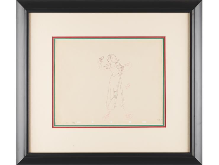 (Walt Disney Studios, 1937) Lovely original production drawing of the title character from Snow White and the Seven Dwarfs, depicting Disney’s original princess in a wonderful full-figure pose holding a broom and speaking to a small bird perched on her finger, with the character image measuring 3.5 x 5.75. Accomplished in graphite and colored pencil on 11.5 x 9 animation paper marked "124" in the lower right corner, and stamped "2001, 3D, 18A" in the lower left corner. Triple-matted and framed to an overall size of 20 x 17.5. In fine condition. An exemplary piece of original hand-drawn production art from Disney’s first animated feature film.