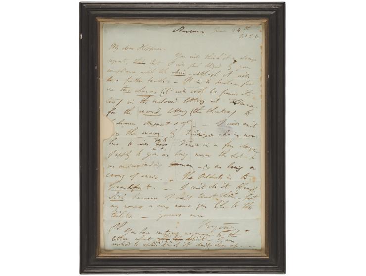 ALS signed “Byron,” one page, 7.75 x 11, June 24, 1820. Handwritten letter from Ravenna to Richard Belgrave Hoppner, the English Consul at Venice and Byron's friend. In part: "You will think it a strange request, but I will feel obliged by your compliance with the whim—although it will be a further trouble—It is to procure for me two chances (it will cost 60 francs the two) in the enclosed lottery at Vienna for the second lottery (the theatre) to be drawn August 1st. I will send the money by Vincenzo who is now here & will go to Venice in a few days. I apply to you as being one near that spot & as an outstanding man & as being a crony of mine…Put my name or any name you like to the tickets." Mounted and framed to an overall size of 10 x 13.5. In fine condition, with seal-related paper loss to the left edge.