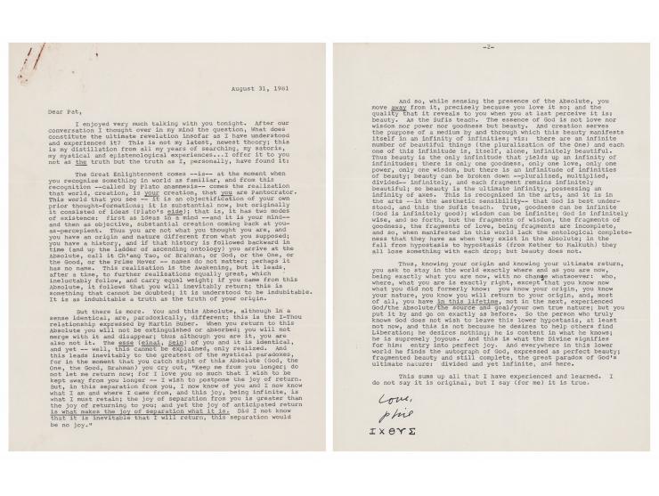 TLS signed “Love, Phil," who adds Greek characters below, "ΙΧΘΥΣ,” two pages, 8.5 x 11, August 31, 1981. Letter to science fiction author Patricia Warrick, in full: “I enjoyed very much talking with you tonight. After our conversation I thought over in my mind the question, What does constitute the ultimate revelation insofar as I have understood and experienced it? This is not my latest, newest theory; this is my distillation from all my years of searching, my satoris, my mystical and epistemological experiences…I offer it to you not as the truth but the truth as I, personally, have found it: