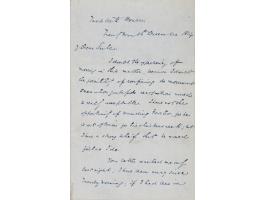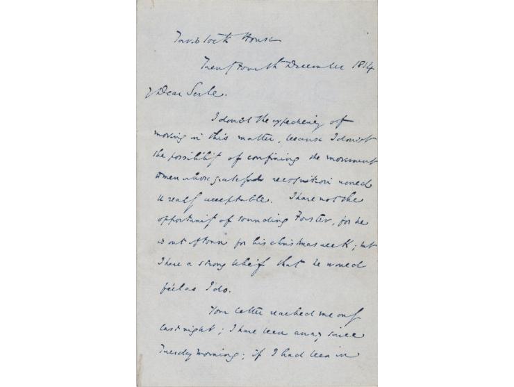 ALS, two pages on two adjoining sheets, 4.5 x 7, December 24, 1854. Handwritten letter to T. J. Serle, sent from "Tavistock House." In part: "I doubt expediency of moving in this matter, because I doubt the possibility of confining the movement to men whose gratified recognition would be really acceptable. I have not the opportunity of sounding Forster, for he is out of town for his Christmas week; but I have a strong belief that he would feel as I do." In fine condition.