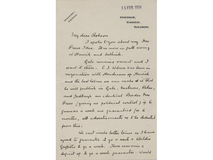 ALS signed “A. Conan Doyle,” two pages on two adjoining sheets, 4.25 x 7, Undershaw letterhead, February 15, 1904. Handwritten letter to A. S. Robson, in part: "I spoke to you about my Free Press Idea. It is now in full swing at Hawich and Selkirk. Gala remains vacant and I want it there. C. J. Wilson has been in negotiation with Henderson of Hawich and the best terms we can make it is that he will publish in Gala, Melrose, Kelso, and Jedburgh an identical Border Free Press (giving us political control) if 6 guineas a week are guaranteed for 6 months, all advertisements &c to be deducted from this. We can't make better terms so I have agreed to guarantee 2 gs a week…Would you write to C. J. Wilson direct & tell him how far local funds could bear this. I don't think party money could possibly be better spent." In very fine condition. Accompanied by the original mailing envelope, addressed in Doyle's own hand.