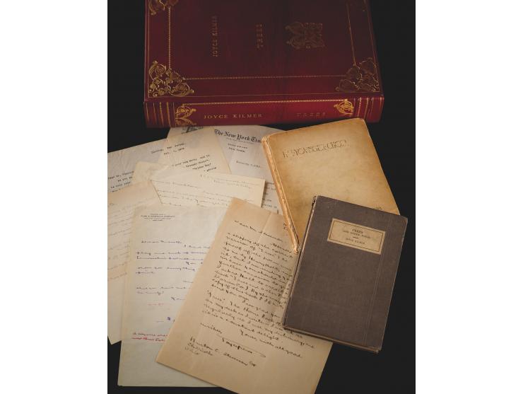 Remarkable archive comprising two books signed by Joyce Kilmer—an inscribed first edition of Trees and Other Poems and the multi-signed limited edition of The Younger Choir—plus correspondence related to their publication, and an autograph manuscript of Kilmer's "Poets."