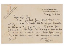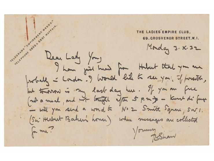 ALS signed “T. E. Shaw,” one page, 7 x 4.5, The Ladies' Empire Club letterhead, October 3, 1932. Handwritten letter to "Lady Young," the wife of English soldier and colonial administrator Hubert Young, author of The Independent Arab, a part-memoir, part-travelogue detailing his diplomatic and military time in the Middle East. In full: "I have just heard from Hubert that you are probably in London. I would like to see you, if possible, but tomorrow is my last day here. If you are free (not a meal, and not tonight after 5 p.m.)—kunst di fuge—will you send a word to No. 2 Smith Square, S.W.1. (Sir Herbert Baker's house) where messages are collected for me." In very good to fine condition, with scattered light foxing, and a rusty paperclip impression to the upper left corner.